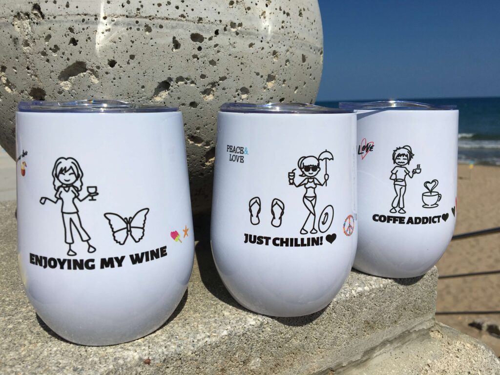 Todos nuestros vasos cumplen con los requisitos de seguridad alimentaria y se imprimen con tecnología digital de alta calidad («Helix® printing»), incluyendo CMYK, blanco y barniz, para colores vivos y precisos. Las amplias áreas de impresión permiten que tu diseño destaque: 251 x 127 mm en vasos acrílicos, 259 x 145 mm en acero inoxidable y 277 x 76 mm en vasos de vino.